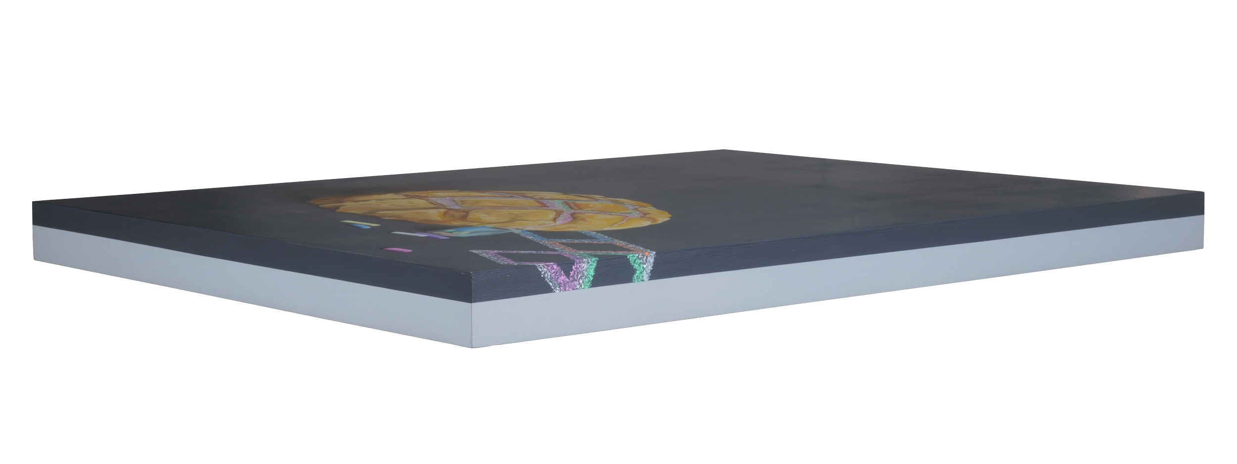Through a blend of airbrushing and traditional brushwork, this piece visually dances between precision and painterly. Painted on top of a manually primed wood panel, it inherits the texture of paint strokes, giving it a dimensional look.