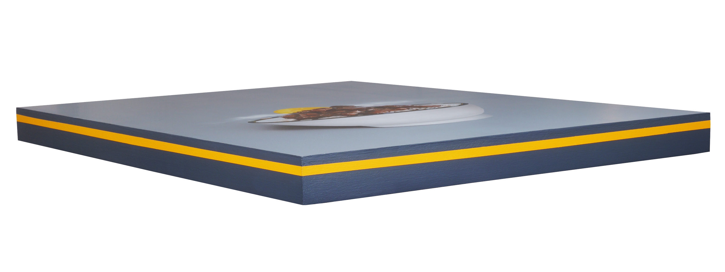 To further illustrate these moments when time stands still, the sides of this piece are painted to mimic the blurry motion of the landscape passing outside the train window.